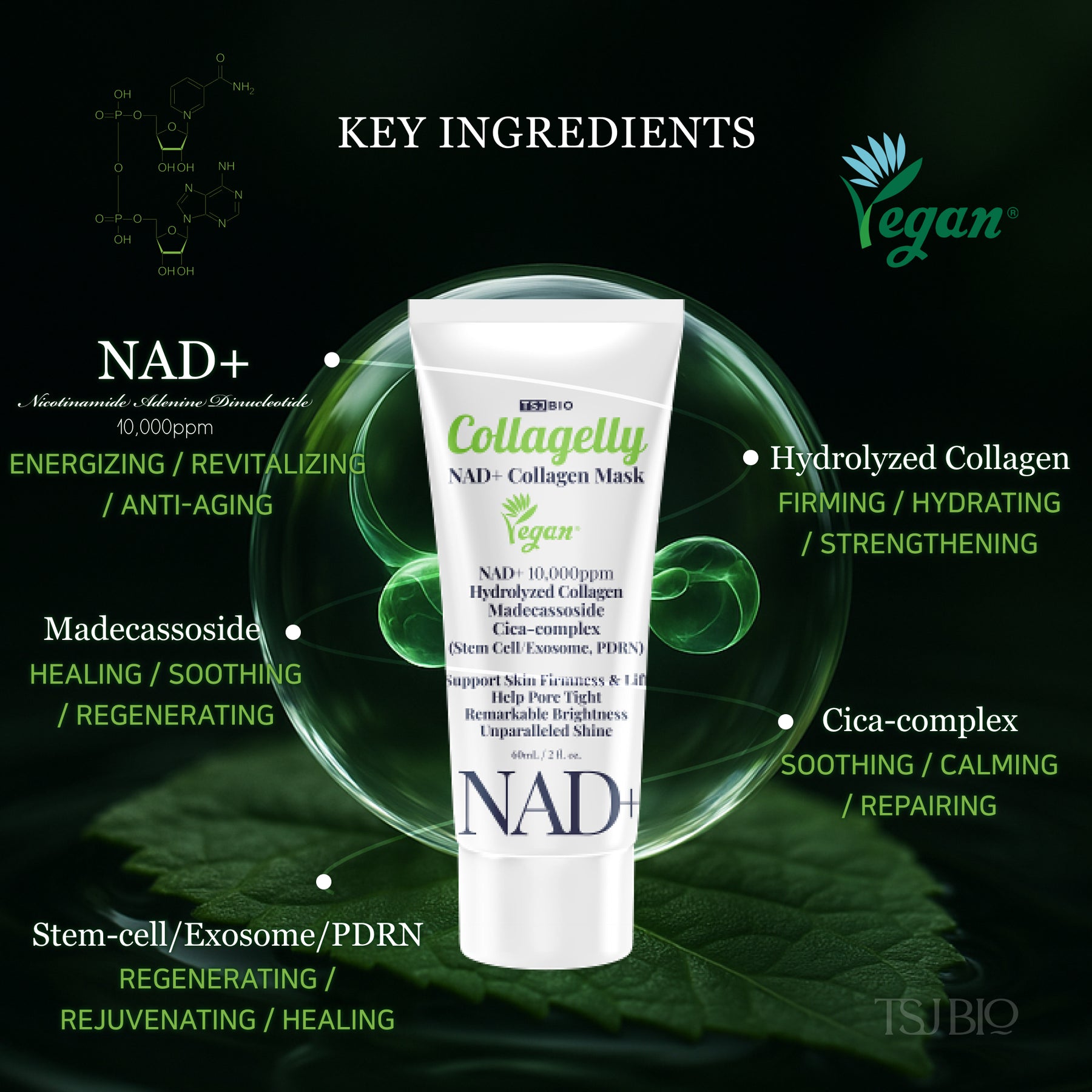 PM, 2–3x per week — After cleansing (and toner/essence if used), apply the NAD+ Serum. Then apply this NAD+ Mask generously over the face. Leave the mask on for at least 30 minutes. Peel off the mask and do NOT rinse your face. Follow with NAD+ Cream to lock in the benefits.