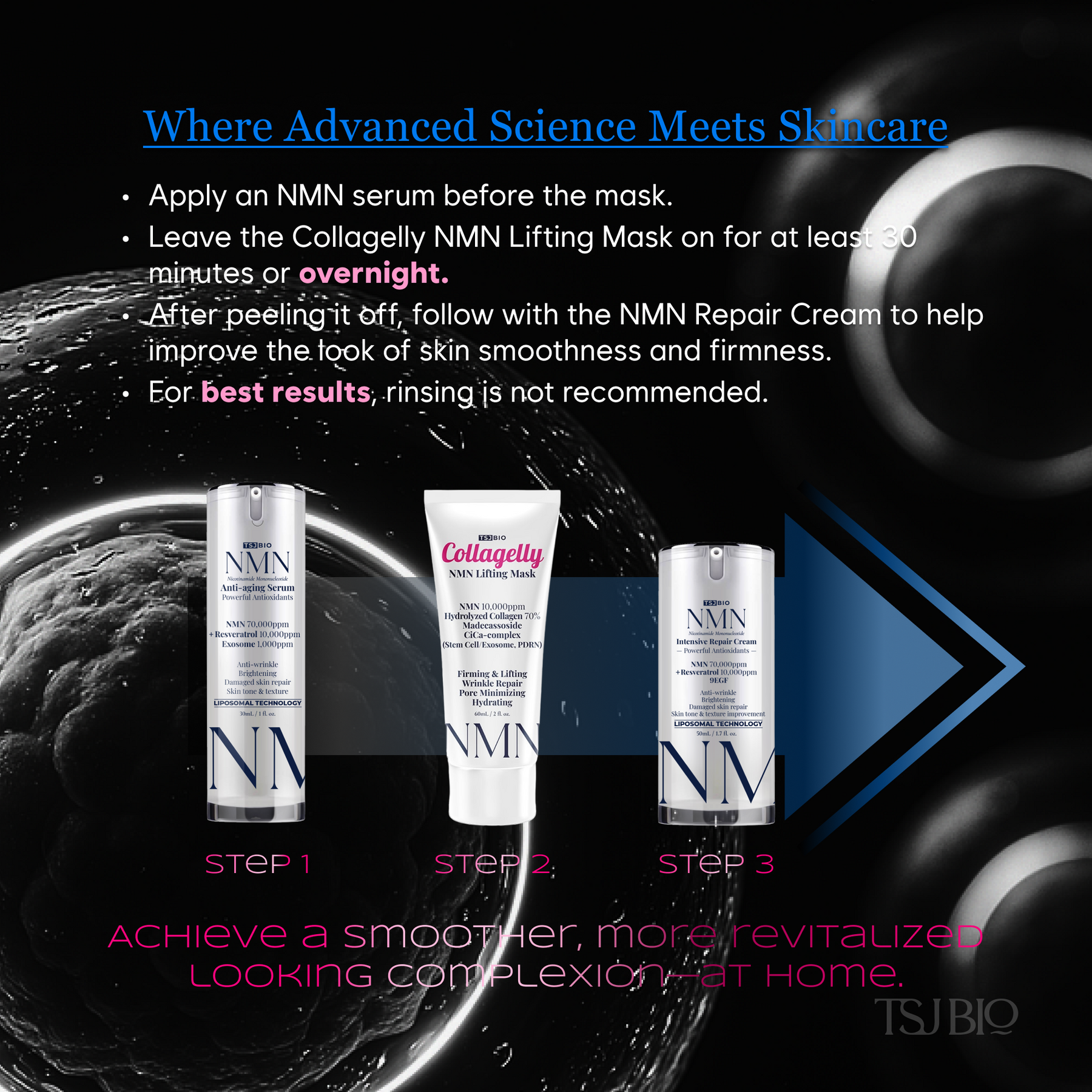 PM, 2–3x per week — After cleansing (and toner/essence if used), apply the NMN Serum. Then apply this NMN Mask generously over the face. Leave the mask on for at least 30 minutes. Peel off the mask and do NOT rinse your face. Follow with NMN Cream to lock in the benefits.
